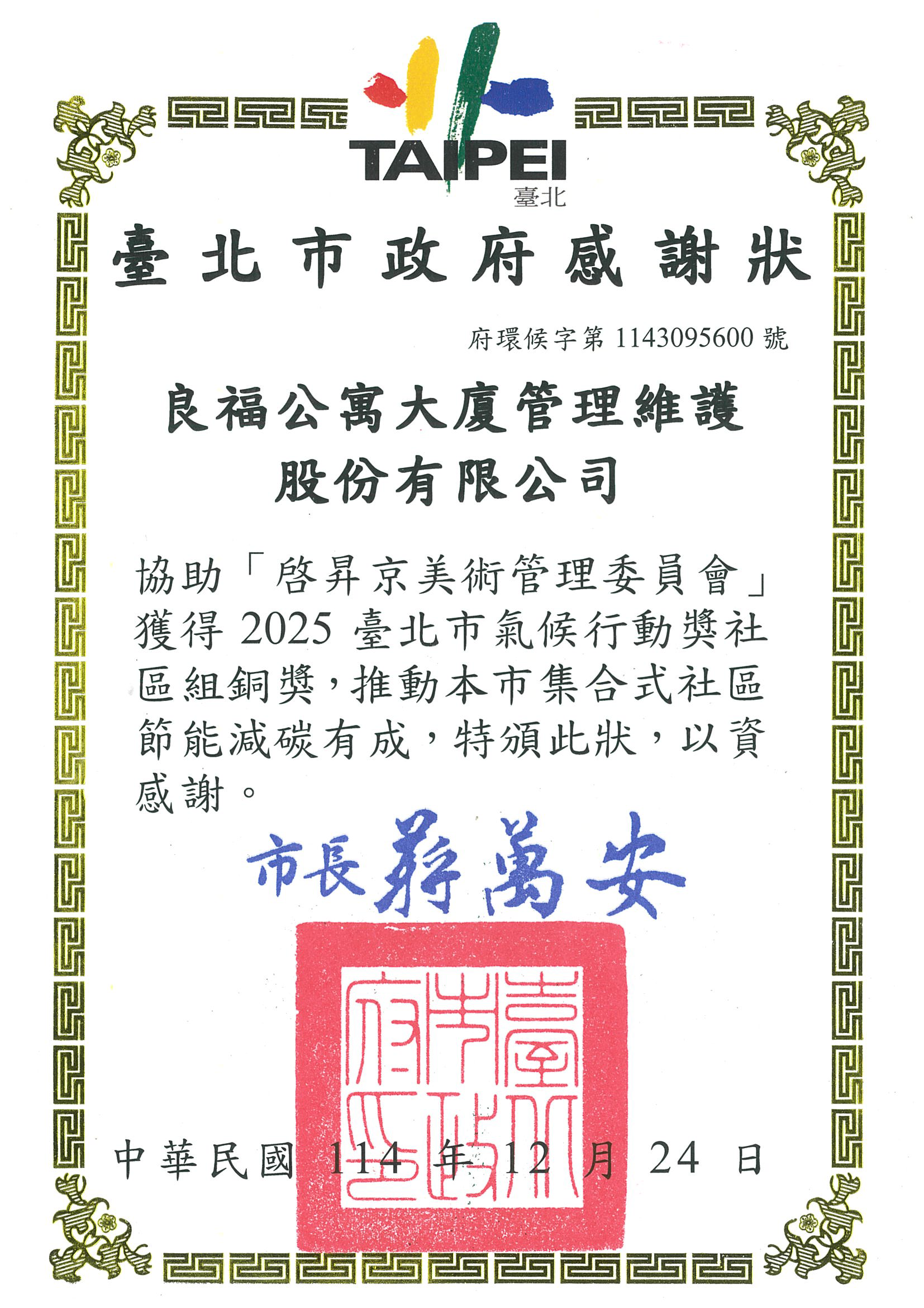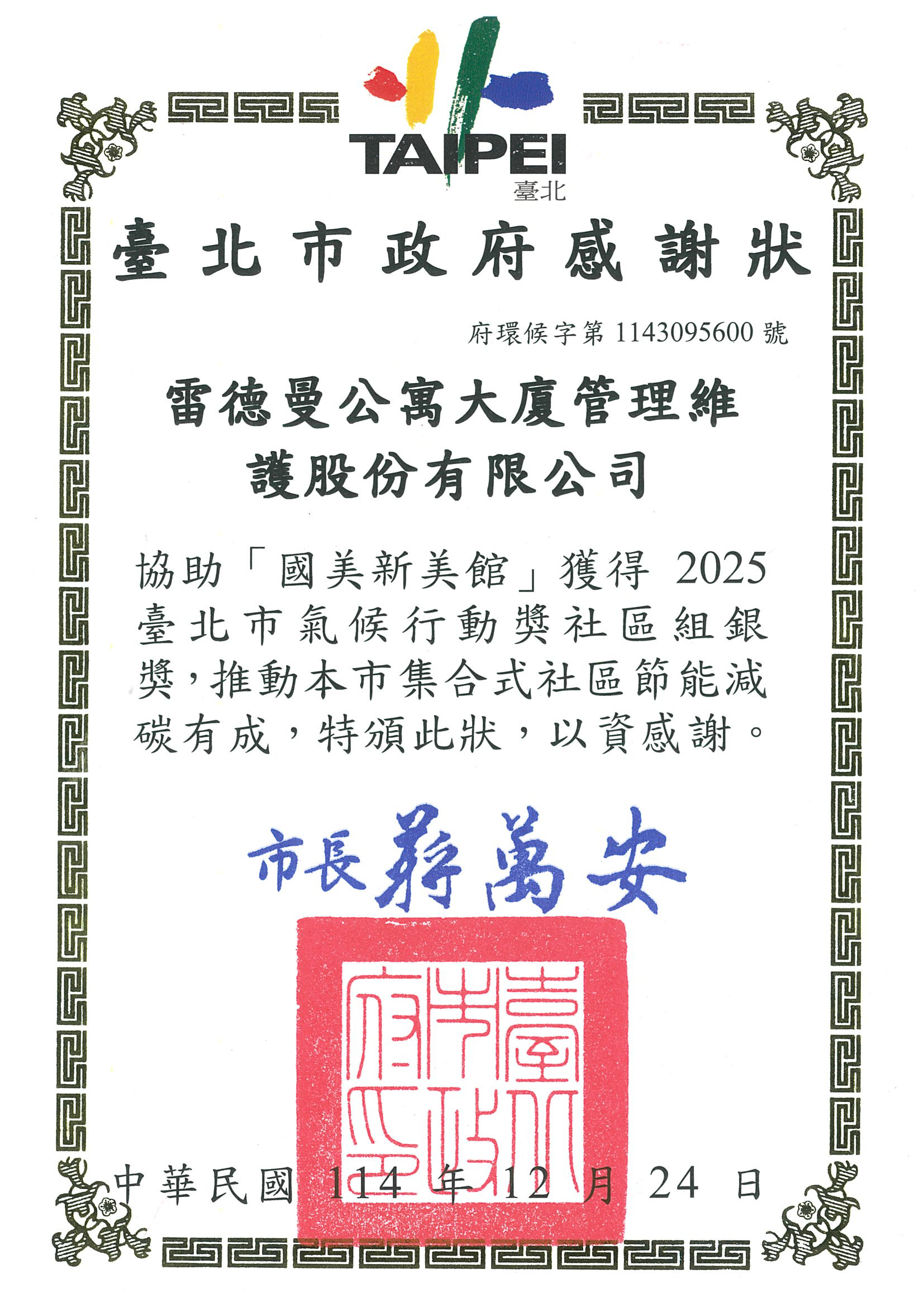 良福集團旗下雷德曼物業、良福物業雙社區榮獲臺北市氣候行動獎肯定